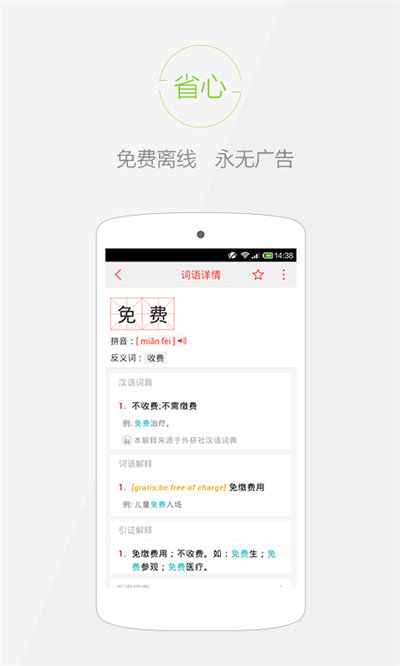 完全免费,无需登录,绝对不加任何广告和插件,做最受欢迎的汉语字典。