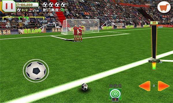 终极任意球是一款3D体育竞技类休闲游戏, 游戏操控简单易上手,只需要根据阻挡人墙的位置、守门员站位以及射门距离等综合条件。它以全3D视角,将足球比赛中扣人心弦的任意球射门场景真实再现。 40个关卡、多种任务模式、3种强力道具、多种道具升级级别,让你身临其境,玩的酣畅淋漓!,选择合适的力量及弧度,让足球绕过人墙障碍和守门员的把守范围,飞入球门死角!