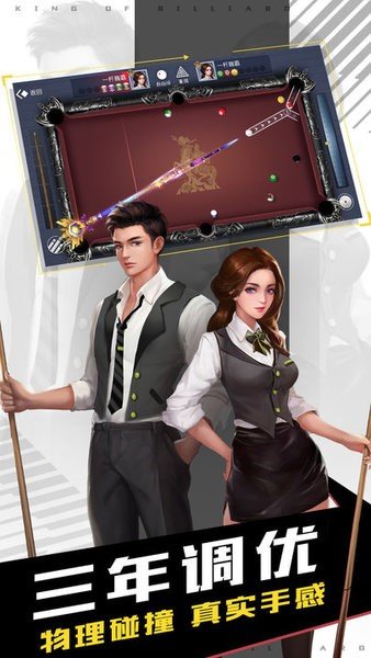 台球王者官方最新版本是广州四三九九信息科技有限公司最新研发运营的一款3D拟真实时对战台球手游,该游戏采用的是3D引擎所打造,因此游戏不仅有着十分精致的画面和细腻的台球桌面,而且它还有着十分炫酷的球杆,若是加以动感愉悦的游戏音效,相信定能给予玩家们不同以往的台球体验。与此同时,台球王者游戏最新版在在玩法上采用了标准的美式黑球8球规则,但经过修改之后新增了一些全新的功能,玩家可以通过蓝牙与好友在线对决,也可以与好友在线对决,更可以将游戏作为一款独立的单机游戏来玩,非常的有趣。同时台球王者游戏在画面上采用的是真实的2D环境,细致的光影设计以及流畅的翻转效果,为玩家提供高清的视觉效果、流畅的游戏体验